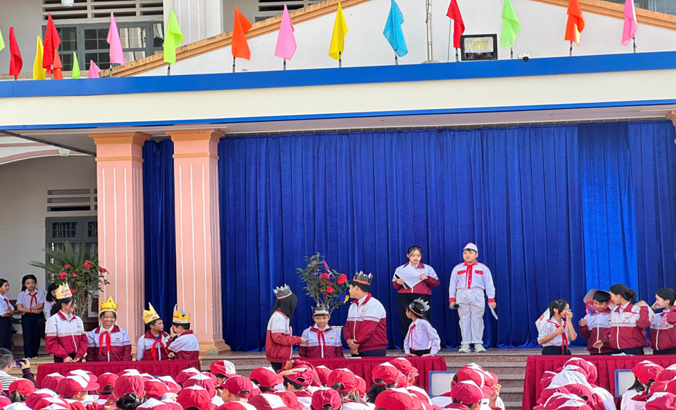 Liên đội nhà trường cùng với lớp được phân công thực hiện chủ điểm tuần theo từng khối lớp lồng ghép các hoạt động tuyên truyền, giáo dục về pháp luật, đạo đức, lối sống, kỹ năng sống, giá trị sống..theo chủ đề. Nội dung bám sát các vấn đề mang tính thời sự, thực tiễn xã hội được học sinh quan tâm. Bằng những hình thức tổ chức linh hoạt của từng khối học sinh tham gia tích cực các hoạt động như văn nghệ thể hiện qua những lời ca, tiếng hát, điệu múa, bài thơ, câu chuyện theo từng chủ điểm, các em biểu diễn rất tự nhiên và phấn khởi.